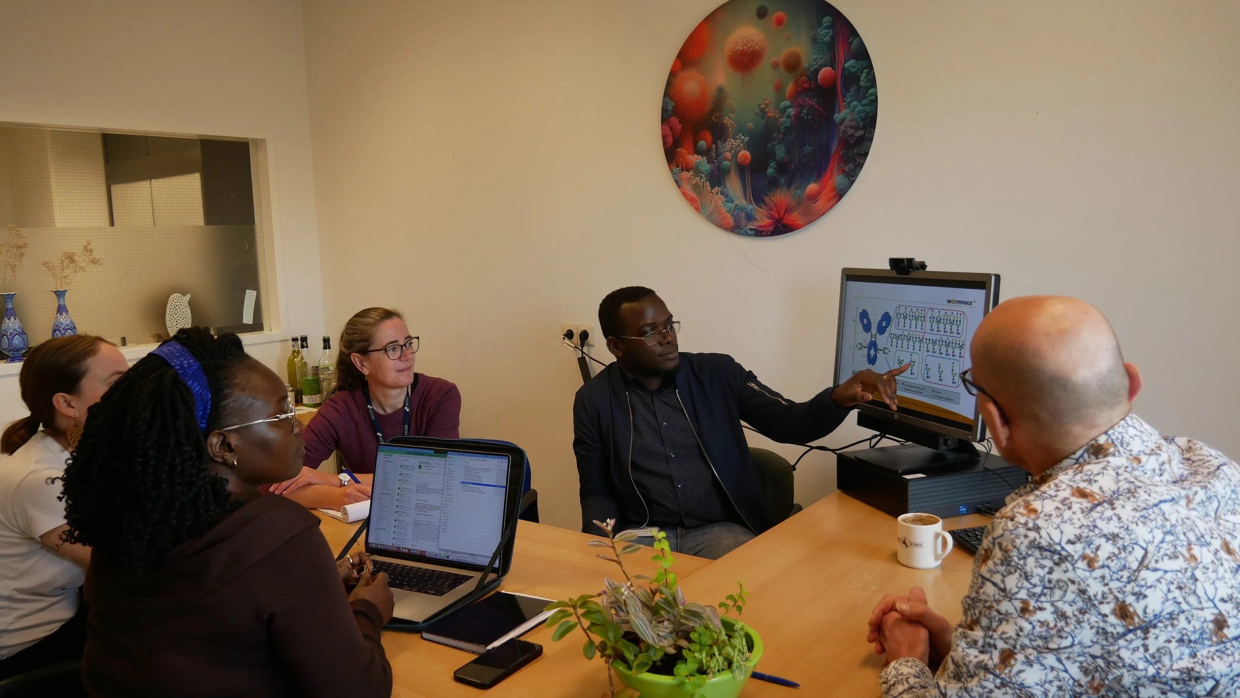 Dr Emma Houlder, Dr Emmanuella Driciru, Dr Angela van Diepen, Dr Moses Egesa, and Prof Dr Cornelis Hokke discussing project-related data at the LUMC.