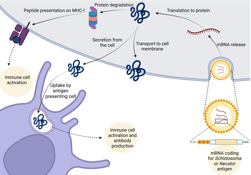 Lipid-nanoparticle encapsulated mRNA encoding the S. mansoni or N. americanus vaccine target is taken up by recipient cells, which translate the mRNA sequence into protein. Depending on the construct, the protein is exposed to the immune system as a secreted or membrane bound antigen. The immune system responds by generating parasite-specific antibodies and immune cells.