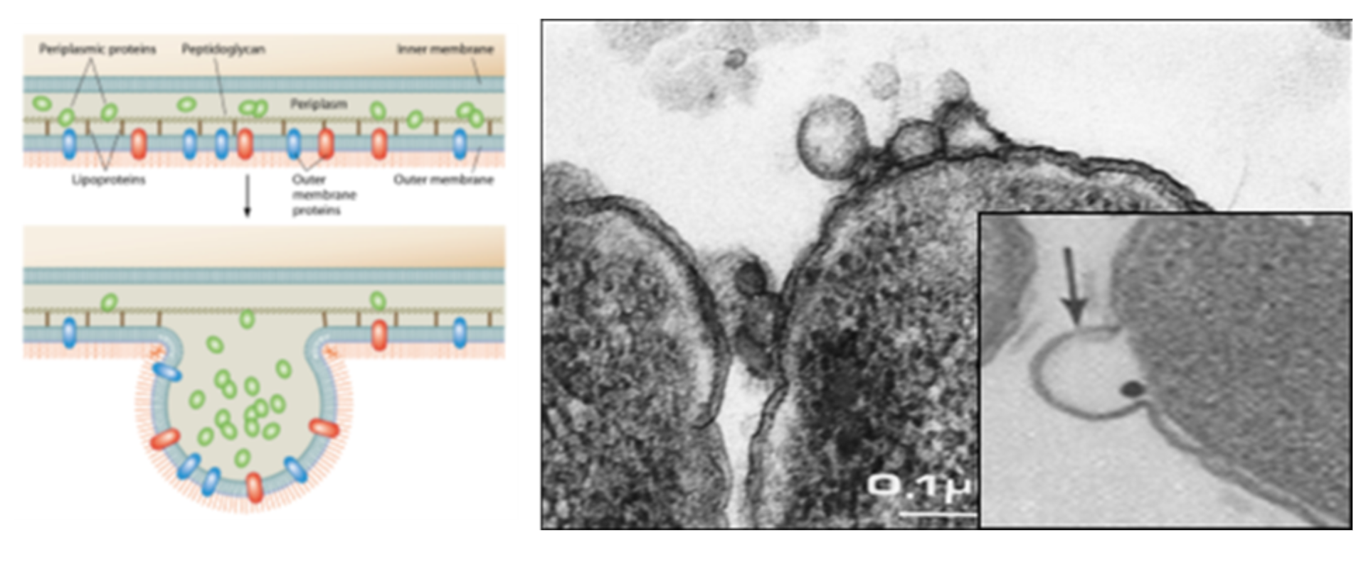 A schematic reconstruction of the mechanism by which bacterial outer membrane vesicles are released and an electron microscope image of a Gram-negative bacterium releasing OMVs (indicated by the arrow in the enlarged detail panel).
